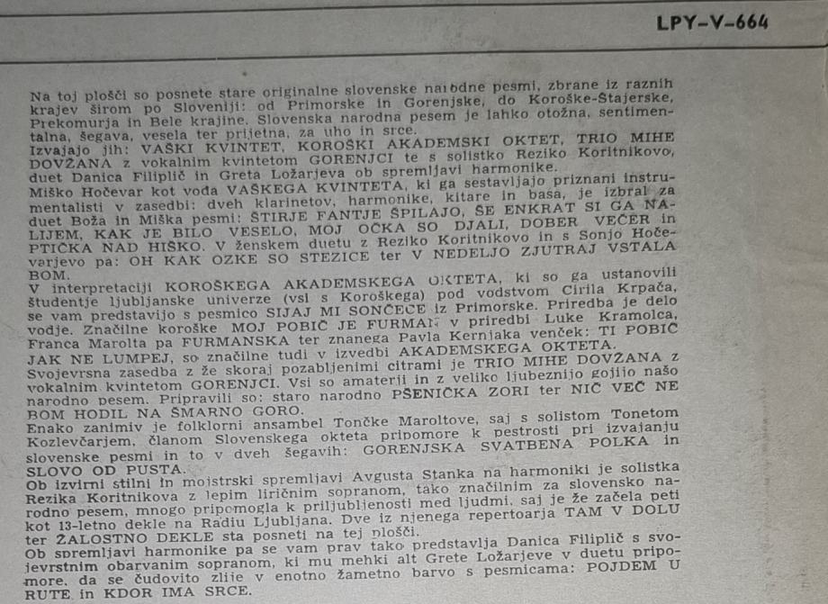 Ob spremljavi harmonike pa se vam prav tako predstavlja Danica Filiplič s svo-jevrstnim obarvanim sopranom, ki mu mehki alt Grete Ložarjeve v duetu pripo-more, da se čudovito zlije v enotno žametno barvo s pesmicama: POJDEM U RUTE in KDOR IMA SRCE.