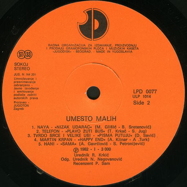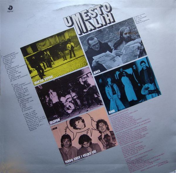 First issue in 3,000 copies in cover with 3D effects (swirl lines) on front. Catalogue number with hyphen - LPD-0077, appears on back cover and spine, the one without hyphen, LPD 0077, on labels. With the title "Umesto malih" (ploča) = "Instead of Small Ones" (meaning: records) the record company wanted to say that they rather released a "big" (an LP) record than five "small" (single) records of five young groups - the latter kind of records lost their popularity in eighties. Two of these groups released later their songs on their own LPs, the other songs appear only on this LP.