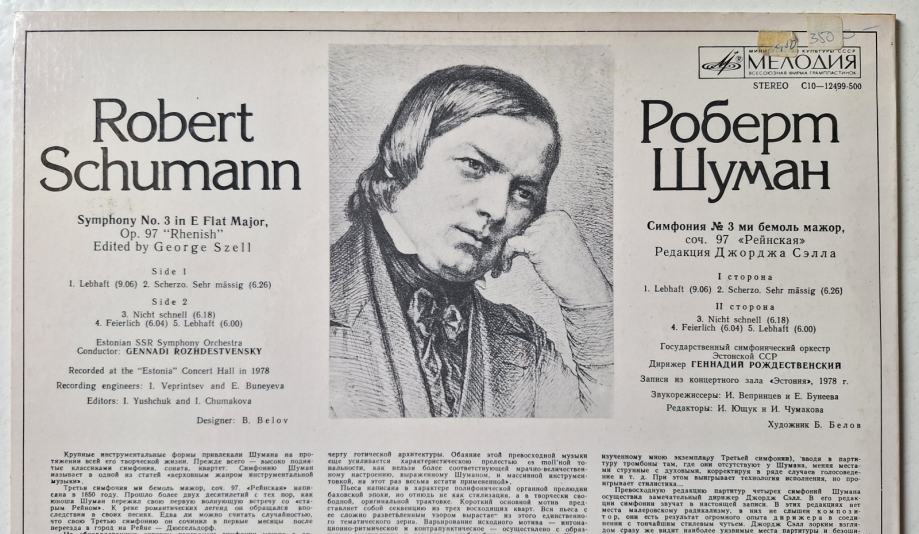 Prodam LP gramofonsko ploščo s posnetkom Simfonije št. 3 (Renska) v Es-duru, op. 97 Roberta Schumanna. Simfonijo izvaja simfonični orkester iz Estonije, pod vodstvom znamenitega (že pokojnega) ruskega dirigenta Genadija Nikolajeviča Roždestvenskega. Več podrobnosti o vsebini plošč je razvidnih na priloženih fotografijah. Plošča je brez napak, datira iz leta 1983 in je bila izdelana v tedanji Sovjetski zvezi. Cena za ploščo je 25 eur. Če želite dostavo po pošti se doda še 4 eur poštnine. Info 041 643 431. Prodam tudi še druga dela skladateljev iz obdobja klasicizma, romantike in baroka. Pokličite za podrobnosti.