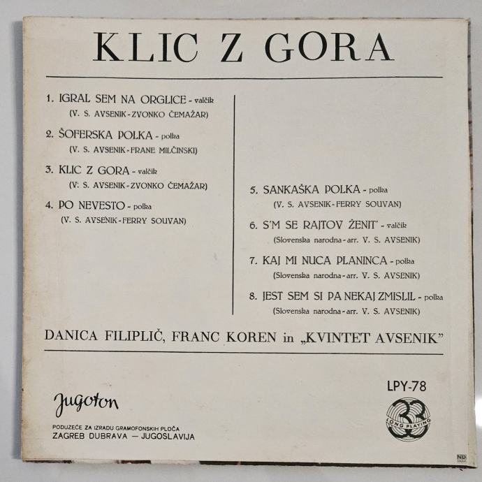 Prodam vinilko - gramofonsko ploščo KLIC Z GORA, Danica Filipič, Franc Koren, Kvintet Avsenik, Jugoton 78.