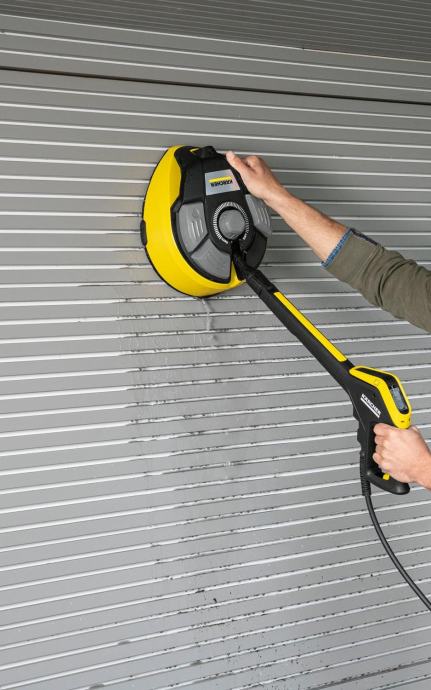 Čistilnik površin T 7 Plus T-Racer je praktična dodatna oprema za vaš visokotlačni čistilnik Kärcher. T-Racer je idealen za čiščenje različnih zunanjih talnih in stenskih površin. Čiščenje terase brez škropljenja z učinkom zračne blazineČistilnik za terase ima dve vrtljivi visokotlačni šobi na spodnji strani naprave, ki sta namenjeni čiščenju večjih površin, kot so terase, pločniki in kamnite plošče. Ohišje deluje kot zaščita pred škropljenjem in preprečuje popolno oškropitev sosednjih predmetov ali oblačil uporabnika. Čistilnik površin je usmerjen naprej proti konici. V njej ima močno šobo za učinkovito čiščenje kotov in robov. Z učinkom zračne blazine visokotlačni čistilnik površin lebdi nad površino, ki jo očistite, in ga lahko premikate sem in tja brez napora.Preprosta menjava šobe s stopalkoPoleg močne šobe in šobe za čiščenje tal ima na sprednji strani vgrajeno šobo za izpiranje, ki neposredno spira raztopljeno umazanijo. S priročnim nožnim stikalom lahko preprosto preklapljate med različnimi šobami. Oddaljenost talnih šob do tal lahko nastavite z vrtljivim kolesom. Nastavitev Soft (mehko) je primerna za občutljivejše površine, kot je les, nastavitev Hard (trdo) pa omogoča zmogljivo čiščenje robustnejših površin, kot so ploščice, beton in kamen.Navpično čiščenje stenPriključite čistilnik za terase brez podaljševalne cevi neposredno na pršilno palico visokotlačnega čistilnika in zlahka očistite tudi navpične površine. Za ergonomski ročaj ohišja lahko T-Racer dodatno držite in lahko tako dobro nadzirate napravo. Tako lahko preprosto očistite tudi garažna vrata ali vrtne zidove. Za čiščenje tal uporabite podaljševalno cev, ki jo preprosto in varno priključite z bajonetnim zapiralom.Čistilnik površin T-Racer lahko uporabljate z vsemi visokotlačnimi čistilniki Home & Garden znamke Kärcher od razreda naprave K 4.