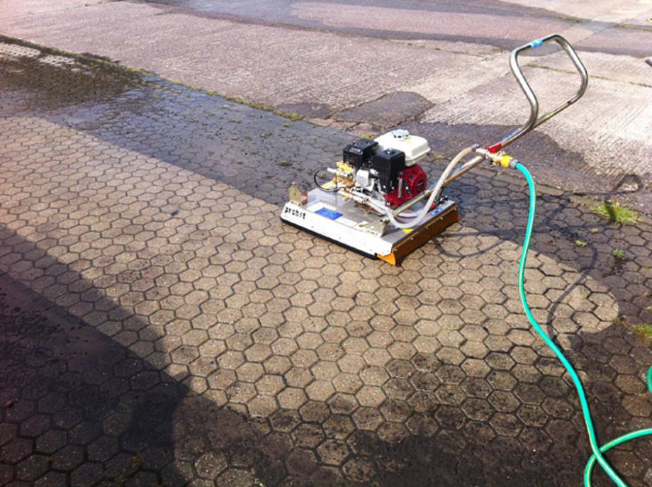 Na voljo je zelo učinkovit, neodvisen od elektrike, visoko tlačni čistilec, z zaščitnim obročem pred brizganjem, za hitro in enakomerno čiščenje betonskih tlakovcev, plošč in oblog iz naravnega kamna. Ne pušča ostankov umazanije na sosednjih površinah, kot je to običaj pri konvencionalnih visoko tlačnih čistilcih. S tem odpade potreba po zaščitni obleki za upravljavca stroja, kot tudi kasnejše čiščenje sosednjih površin sten, oken in podobno. Čiščenje poteka zelo enakomerno, voda prodira v vse pore in fuge. Pritisk je ravno tolikšen, da odstrani mah, ki se nabira v fugah, ne prodira pa pregloboko v fuge, da popolnoma ne izpere fug.