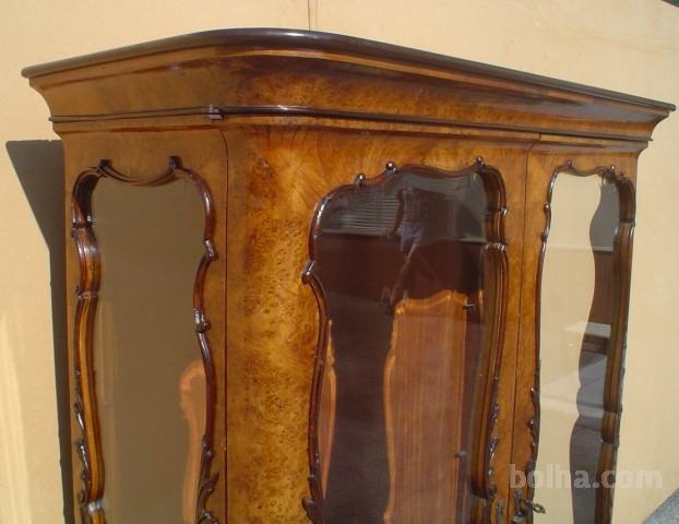 ČUDOVITA ORIGINALNA STARINSKA VITRINA V BAROČNEM STILU. IZDELANA JE V ZAČETKU 20.stol. IZ MASIVNEGA LESA, FURNIRANA Z ZELO LEPIH FURNIRJEM-IZBRAN MAZER FURNIR-PTIČJI JAVOR. VITRINA JE ZELO LEPO OBLIKOVANA-TREBUŠASTA, DVOJE VRAT Z ORIGINAL OKOVJEM, REZLJANE NOGE IN IZREZLJANI OKVIRJI VRAT. ŠE POSEBEJ JE ZANIMIVA ZARADI SVOJEGA ATRAKTIVNEGA IZGLEDA IN ZELO KVALITETNE IZDELAVE. VSA STEKLA IMAJO BRUŠENO FASETO, ZNOTRAJ STA DVE STEKLENI POLICI, KI NISTA VIDNI NA FOTOGRAFIJAH. VITRINA JE V ODLIČNEM STANJU IN PRIMERNA ZA TAKOJŠNJO UPORABO. LUKSUZNI KOS POHIŠTVA ZA POŽIVITEV MODERNO OPREMLJENIH PROSTOROV. FOTOGRAFIJE POVEDO VSE. MERE: š:110-124cm, v:166cm, g:43-48cm.