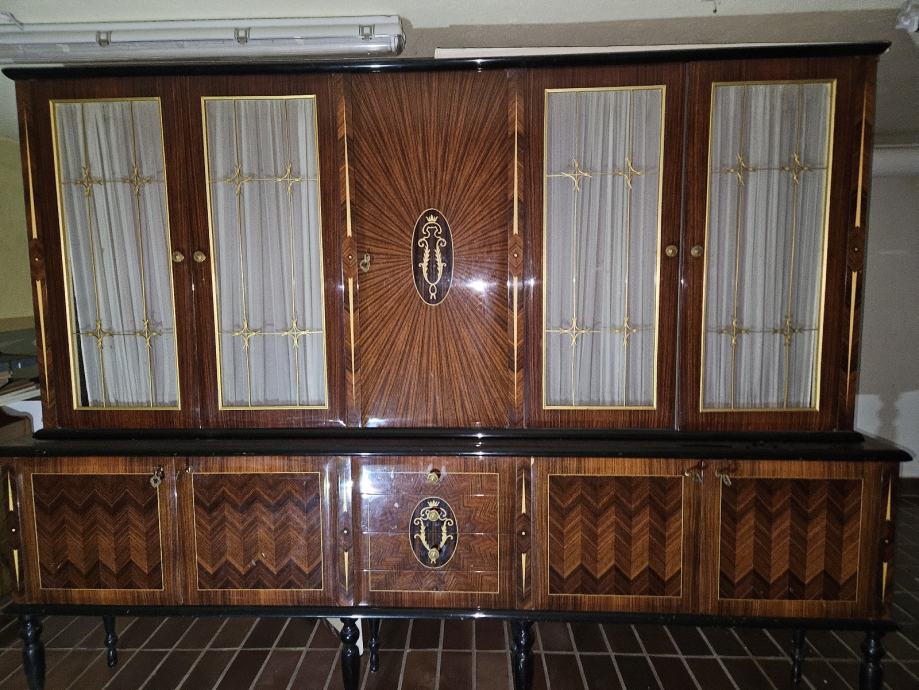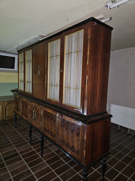 Vitrina je izdelana iz masivnega lesa in kakovostnega furnirja, po strukturi in vzorcu najverjetneje oreh (orehov furnir), ki je bil zelo cenjen v obdobju 1950–1970 (sredina prejšnjega stoletja). Značilni geometrijski vzorci, intarzije in zastekljena vrata z zavesicami jasno kažejo na retro / mid-century slog, pogost v takratni srednjeevropski in jugoslovanski izdelavi.