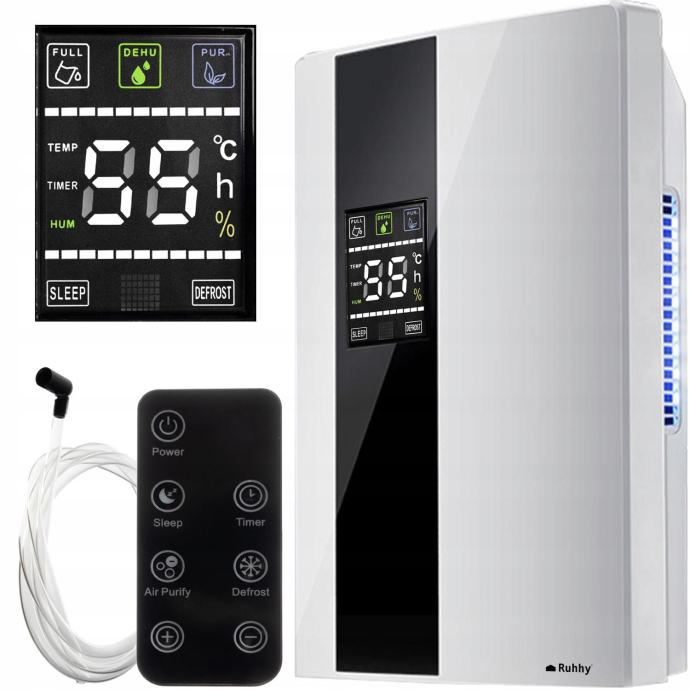 SPECIFIKACIJA – higrometer: da; vlažilec: da; termometer: da; jasen, osvetljen LCD zaslon: da; časovnik: 1-24h; Funkcija SLEEP: da; Funkcija ODMRZOVANJA: da; daljinsko upravljanje: da; odtočna cev kot alternativa odtoku vode: da; tehnologija razvlaževanja: Peltierjev modul; indikator polnjenja rezervoarja; Bela barva; material: plastika / kovina; učinkovitost: 350 ml na dan; prostornina rezervoarja za vodo: 1800 ml; velikost sobe: max 30m2; glasnost: 40db; moč: 90W; samodejni izklop po polnjenju rezervoarja: da; Primerno za: dom, pisarno itd.; odstranljiv rezervoar za vodo; odstranljiv pokrov rezervoarja za vodo; ročaj za prenašanje: da; l mere: 37,5 x 25 x 14 cm; dolžina kabla: 1,5 m; teža: 1,75 kg