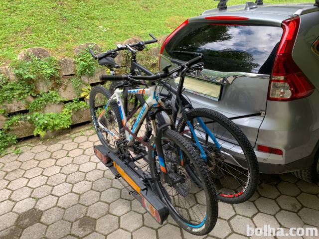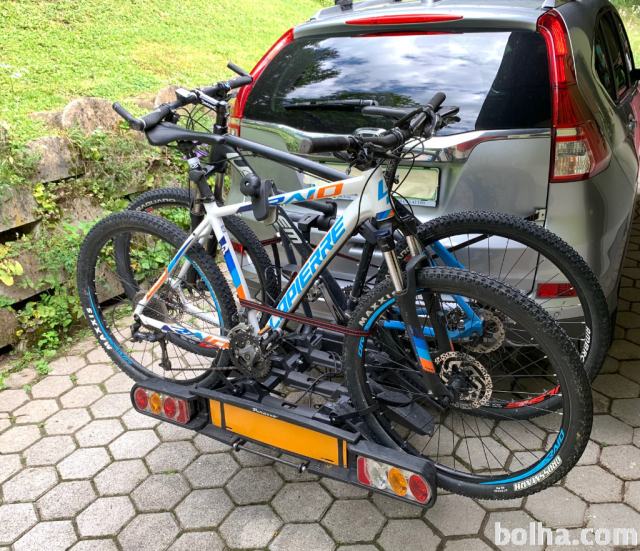 Nosilec za tri kolesa za na vlečno kljuko. Nosilec je zložljiv in tako zavzame manj prostora doma ali za shraniti v prtljažnik avta, ko greste na turo. Je preklopen za možen dostop v prtljažnik, ko so kolesa že na nosilcu. Zložen je dimenzij približno 75 x 60 x 30 cm, teža nosilca cca 16 kg, nosilnost do 60 kg. Vse deluje. Starost 4 leta. Link na opis in predstavitev proizvajalca https://www.peruzzosrl.com/cz/bike-carrier/tow-hook/pure-instinct-tow-ball-carrier.php