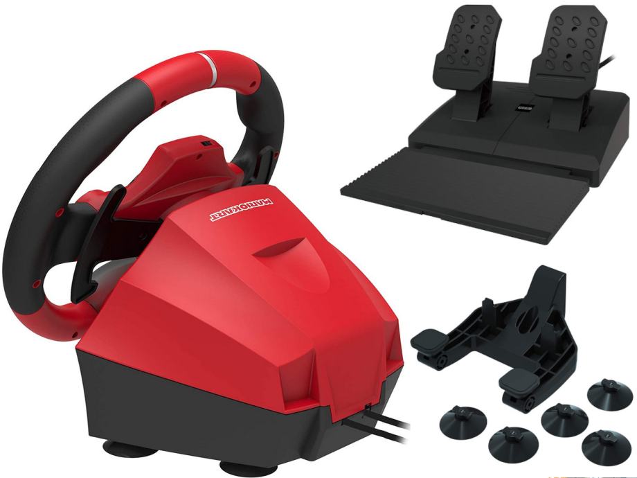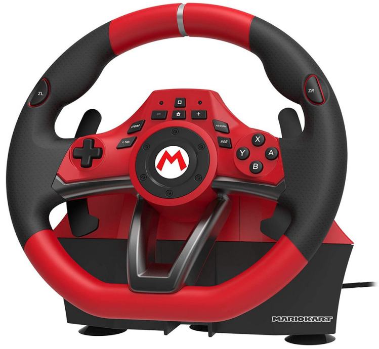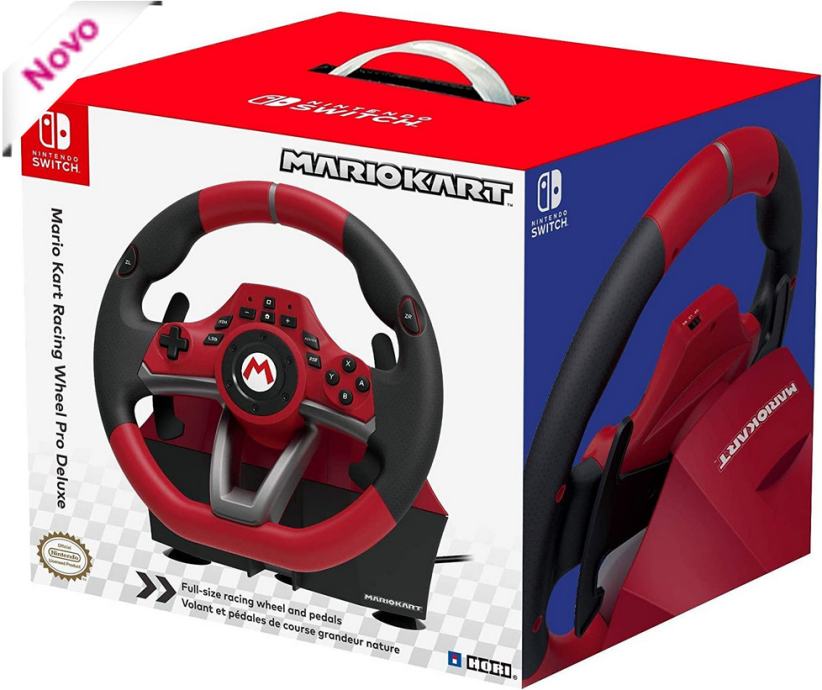HORI Nintendo Switch Mario Kart Racing Wheel Pro DELUXE dirkalni volan za Mario Kart in druge dirkaške naslove. Volan v pravi velikosti je Ergonomsko zasnovan, pedal in priročni upravljalniki na volanu so narejeni tako, da ustvarijo dirkalno simulacijo. Uradno licenciral Nintendo.
