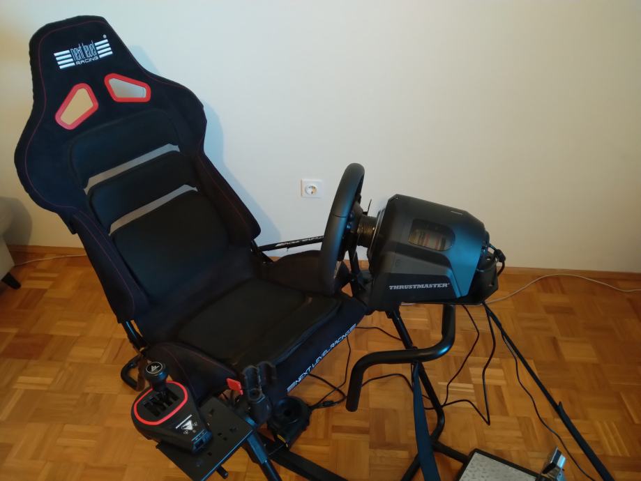 Prodam volan Thrustmaster T-GT II v kombinaciji s Thrustmaster T-LCM pedali, menjalno ročico TH8S in kokpitom Next Level Racing GTLITE PRO.