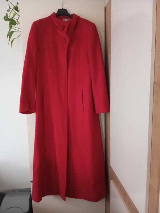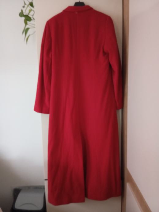 Zelo lepo ohranjen, volnen, ima skrite gumbe, od ene pazduhe do druge meri 50cm, dolžina je 130cm, na spodnjem delu ima v blagu manjše luknjice od molja, potrebno bi ga bilo skrajšati (zadnja slika), orig. vel. je 38, primeren je tudi za 40, ne menjam, ptt ni vključena v ceno