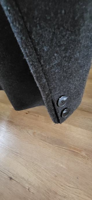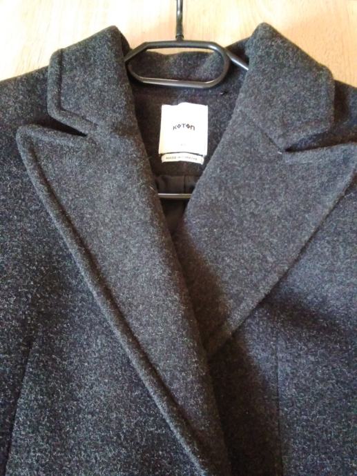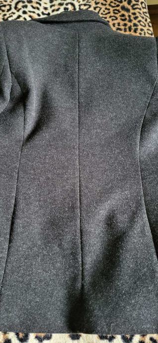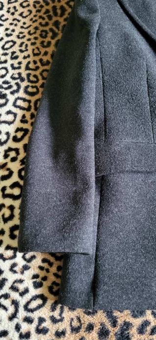 Topel ženski polsezonski plašč, temno siv s žepi.