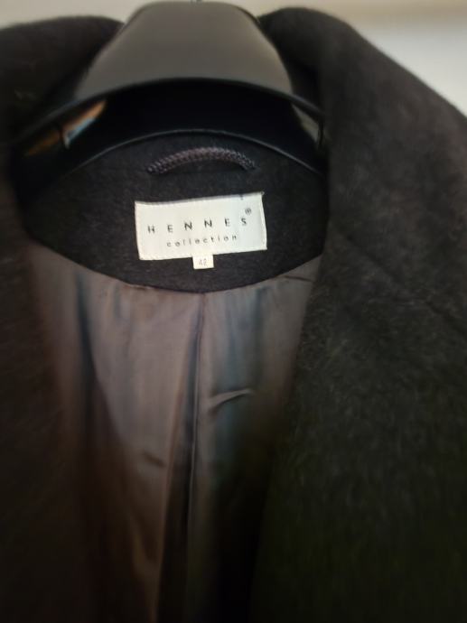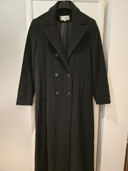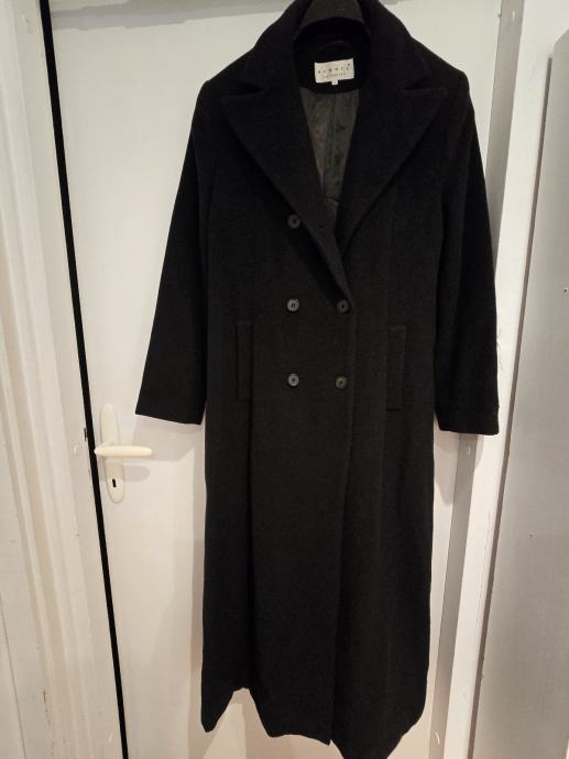 Eleganten črni ženski plašč velikosti 42, izdelan iz kakovostne mešanice kašmirja in volne. Plašč je v rabljenem stanju, a še vedno ohranja svoj luksuzni videz in toplino, ki jo zagotavlja vrhunski material.
