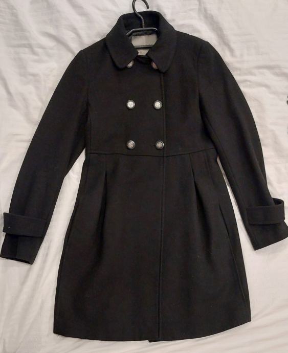 Črn zimski plašč Zara, z dvojnim zapenjanjem, okroglim ovratnikom in všitimi stranskimi žepi.