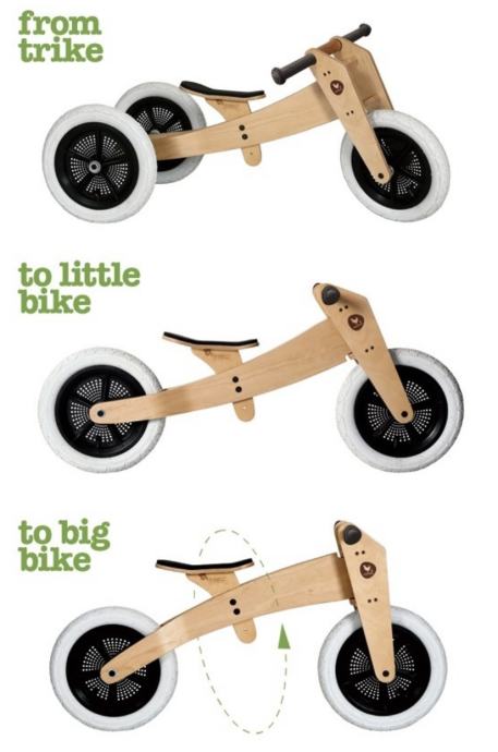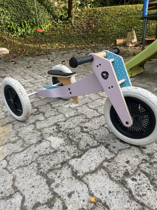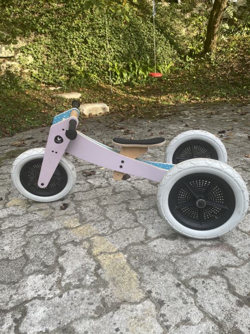 Lesen poganjalec v roza in modri barvi. Zelo lepo ohranjen. Omogoča transformacijo iz tricikla v mali poganjelec in večji poganjalec.