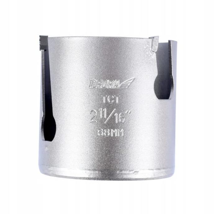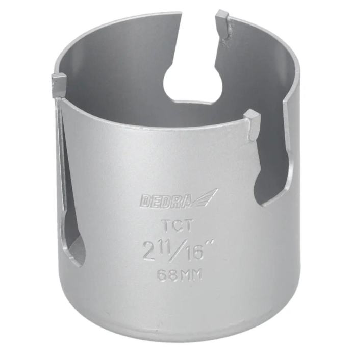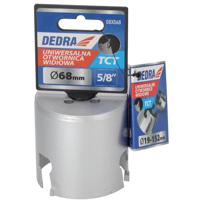 Posebna zasnova rezalnega roba poveča trdnost vrtalne žage in izboljša vodenje lukenj. Z uporabo vpenjalnih glav HEX 10 mm 1/2″ 08X001 (priporočeno za luknje: 08X019-08X030) in 5/8″ vpenjalnih glav 08X002 (priporočeno za luknje: 08X032-08X152) je možno uporabljati vrtalne žage na svedrih ali vijačnikih. Uporaba SDS+ vpenjalno glavo 08X 003 (priporočeno za luknje: 08X 032 – 08X152), je možno uporabiti široko razširjeno žago za luknje DEDRA 08 X z udarnim vrtalnim kladivom v načinu brez udarnega vrtanja. Da bi izboljšali učinek rezanja in povečali moč, imajo luknje več vstavkov vilic, ki učinkovito obdelujejo material. Z uporabo ustreznega vodilnega svedra se lahko univerzalni pilotni svedri DEDRA 08 X uporabljajo za delo z lesom, kovino, pohištvenimi ploščami, PVC-jem, mineralnimi materiali, kot so keramične ploščice, celičasti beton in silikat. Za povečanje trdnosti izvrtin je jedro izdelano iz visokokakovostnega #45 HCS jekla debeline 1,5 mm, zobje pa iz volframovega karbida s 6% kobalta (volframovo jeklo YG 6X). To izboljša kakovost in vzdržljivost odrezkov ter poveča učinkovitost vrtanja.