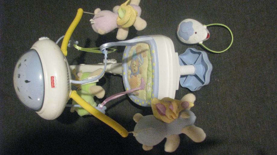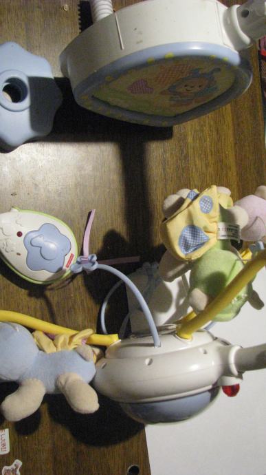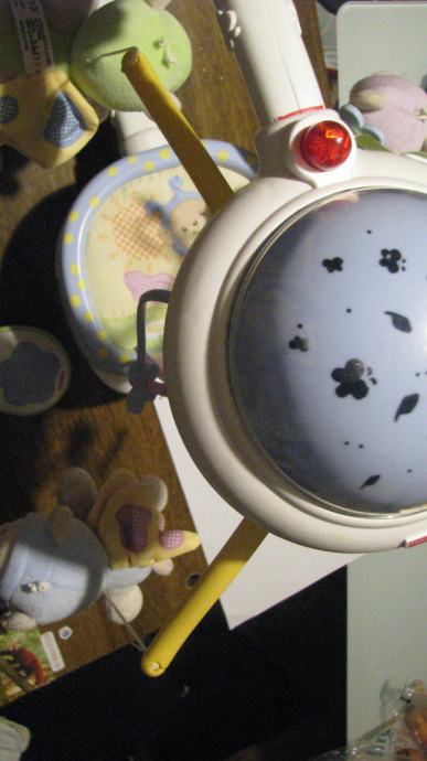 Vrtiljak z obesankami metuljčki, nočno lucko ter prikazovalnikom metuljčkov na steno v temi in predvaja vec razlicnih uspavank, tudi ptičje petje in zvoke iz narave.. Upravlja se lahko z daljincem ali pa z gumbi na vrtiljaku. Posljem po pošti. Montira se lahko nad posteljico. cena s ptt 25ev