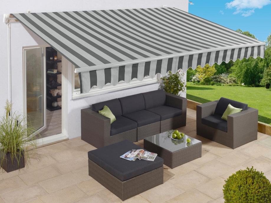 Kakovostna markiza s pregibnimi rokami Aventura je dekorativna in praktična zaščita pred soncem za vašo teraso ali balkon. Tako boste zunaj sproščeno uživali zaščiteni pred soncem v prijetni senci. Lepa kombinacija sivih in belih črt pri tem daje vtis svežine, tako da bo markiza vedno privabljala poglede.Premišljena konstrukcija s kakovostno tkaninoBlago te markize s pregibnimi rokami ali markize z navijanjem je navito na gred in ga napneta dve roki, ki se iztegneta. Volant valovite oblike krasi mehanizem za izteg markize. Zagotavlja privlačen videz in hkrati prekriva roki z njuno tehniko. Z velikostjo 400 cm × 250 cm blago zagotavlja veliko sence. Blago markize je 100-odstotna poliestrska tkanina (280 g/m²). S svojo PU-prevleko je vodoodbojna in odporna proti UV-žarkom. Markiza Aventura tako vedno navdušuje s svojo bogato, svežo barvo.Trdna, odporna proti udarcem in z udobnim upravljanjemPrašno lakiran aluminijast okvir zagotavlja trdnost in preprosto rokovanje, tako da lahko z nekaj preprostimi gibi markizo uporabite kot dekorativno zaščito pred soncem. Ročica omogoča brezstopenjsko zlaganje in raztegovanje markize. Robustno varovalo pred dvigovanjem v ležaju roke tudi ob močnih sunkih vetra ščiti pred poškodbami. Senčilo po želji namestimo na steno hiše ali na strop terase/balkona. Pri tem lahko želeni naklon nastavljamo od 0° do najv. 45°.