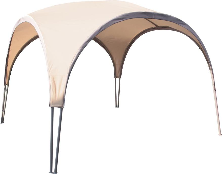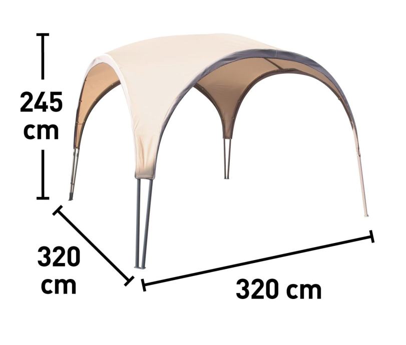 S paviljonom Oromocto si v trenutku ustvarite dekorativno in učinkovito zaščito pred soncem v svojem vratu ali na terasi. Z dimenzijami 245 cm x 320 cm x 320 cm (V x Š x G) nudi vrtni paviljon prostorno prekrito površino za vašo vrtno garnituro ali vrtne ležalnike. Paviljon je primeren tudi kot lep prostor za zabave in večere ob žaru s prijatelji.Nenavadna oblika v trdni izvedbiVrtni paviljon s kupolasto obliko v videzu sončnega jadra je prava paša za oči v vaši zeleni oazi. Trdno ogrodje je izdelano iz prašno lakiranih jeklenih cevi v sivi barvi. Primerno usklajena je streha paviljona iz bež poliestra. Material je preprost za nego in ščiti pred sončnimi žarki in rahlim dežjem. Paviljon je zelo hitro postavljen in ga lahko zaradi lahke izvedbe z maso približno 13 kg preprosto prestavite. Tako ga lahko vedno uporabite tam, kjer je trenutno potreben.