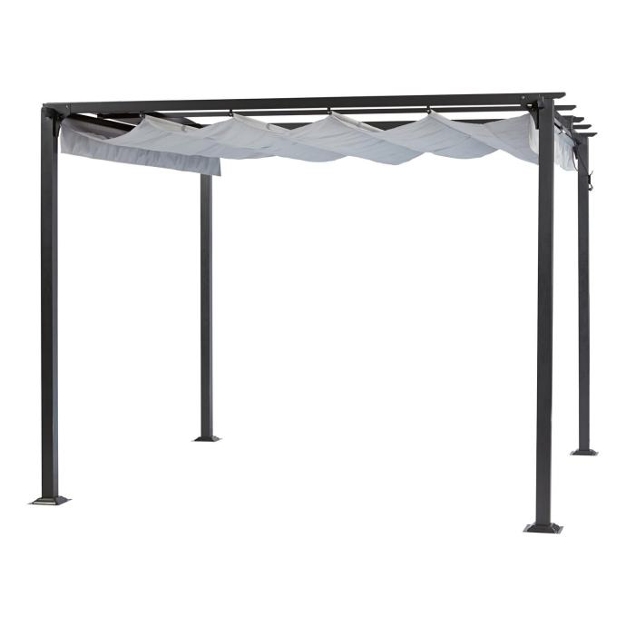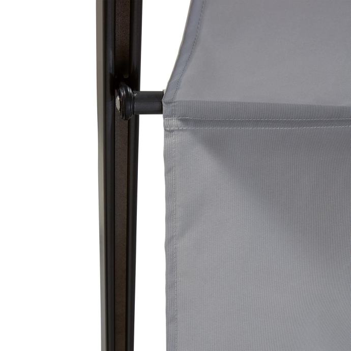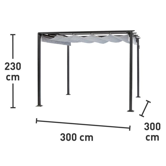 Eleganten paviljon Texhoma ponuja eleganten nadstrešek za vrtno pohištvo in zaščito zunanjega območja za prijetno druženje. Čudovit vrtni paviljon lahko postavite na vrt ali teraso.Vrtni paviljon z zložljivo strehoZložljivo lamelno streho je mogoče po potrebi odpreti ali zapreti z vrvico. Tako lahko hitro in preprosto uživate na soncu ali si zagotovite prijetno senco. Mere pergole znašajo 230 cm x 300 cm x 300 cm (V x Š x G), zato ponuja prostor za več oseb ali vrtno garnituro.Pergola kot zaščita pred soncem s stabilnim jeklenim ogrodjemRobustno jekleno ogrodje v antracitni barvi je zaradi svoje stabilnosti in trdne postavitve varno, omogoča pa tudi preprosto montažo. Jeklo je praškasto lakirano in ga odlikujeta odpornost proti vremenskim vplivom ter dolga življenjska doba. Trpežna tkanina je izdelana iz 100-% poliestra v sivi barvi. Zaradi majhne teže je rokovanje z lamelno pergolo preprosto. Skoraj se ne mečka ter ohranja enakomeren videz v vročini in dežju. Da boste v paviljonu še dolgo uživali, je treba tkanino jeseni in pozimi odstraniti - odvisno od vremenskih razmer. Zložljivo streho je mogoče preprosto odstraniti, jekleno ogrodje pa lahko ostane zunaj tudi v slabem vremenu ali pozimi. Montažni material za kovinsko pergolo je vključen v obseg dobave
