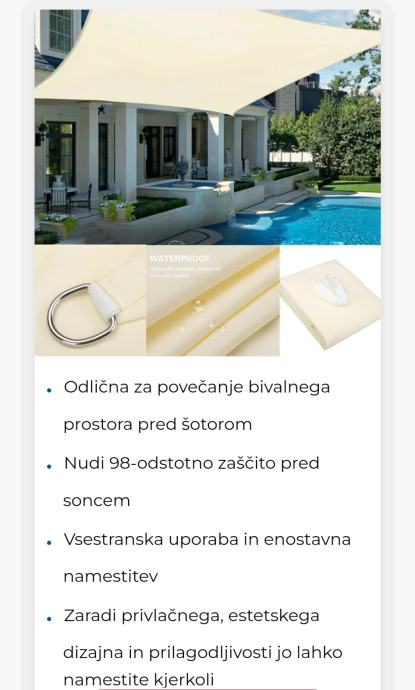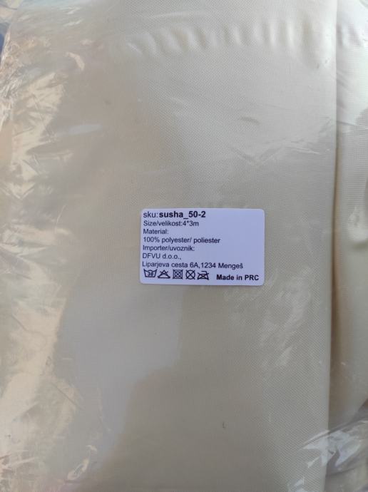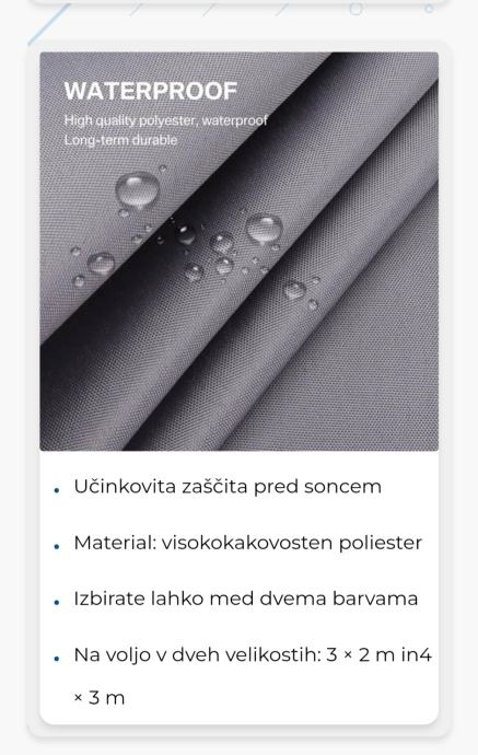 Prodam novo senčilo, mere 4*3m, bež barve, na vogalih ima kovinske rinke za pritrditev, zraven so še štiri vrvice.