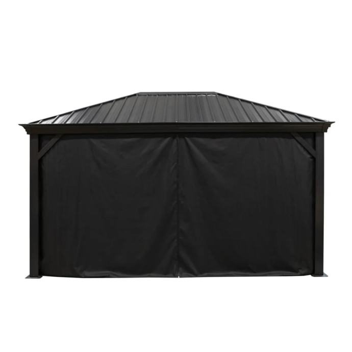 Moderni, trpežni in odličen izgled so odlike novih aluminijastih paviljonov največjega in najbolj znanega kanadskega proizvajalca paviljonov SOJAG. Glavna razlika od ostalih paviljonov je v materialu strehe. Tukaj je namesto plastičnih plošč ali blaga uporabljeno trpežno in stalno oblikovano jeklo. Izjemna snežna obremenitev in vsi aluminijasti deli trajno brez rje! Pocinkana prevleka brez težav prenese vse vremenske vplive, dež, sneg ali sonce, enako velja za trdno konstrukcijo iz odpornega, prašno barvanega aluminija (debelina stebra 12 cm). Tudi vijaki so iz nerjavečega jekla. Paviljona zato pozimi ni treba razstaviti. Z integriranimi deževnimi žlebovi za nadzorovano odvajanje deževnice. Obseg dobave vključuje komarnike iz najlona in dvotirne letve za dodatno pritrditev zaves.