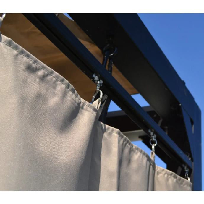 Vrtni paviljon je tudi čudovita zaščita pred soncem in vetrom.Tesno tkane zavese iz 100% poliestra zadržujejo premočno sončno svetlobo in nekoliko močnejše vetrove. Hkrati je material za zavese vodoodbojen, tako da vam ni treba hiteti v hišo, ko se v vašem vrtnem paviljonu sprošča, tudi če rahlo poleti dežuje.