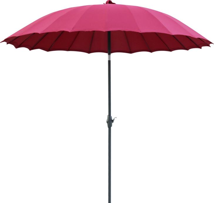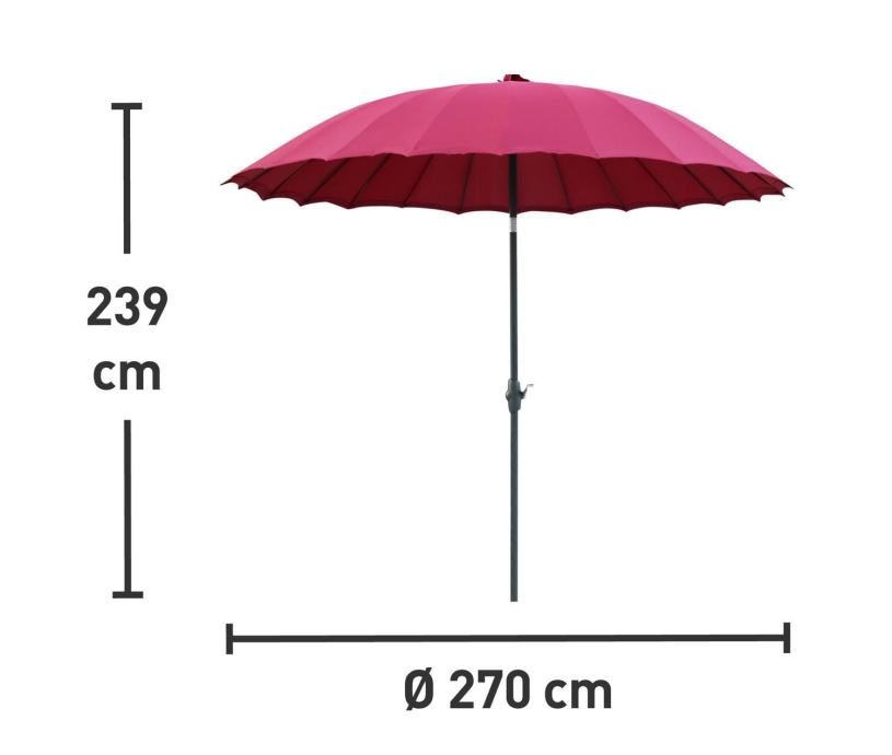 Eleganten tržni dežnik Limon zagotavlja senco na vaši terasi ali vrtu. S svojim posebnim dizajnom v vaš dom prinese duh daljnega vzhoda. Njegov velikodušno odmerjeni premer in visok zaščitni faktor poskrbita, da lahko poleti brezskrbno preživljate čas na prostem.Nagibni senčnik z ročičnim mehanizmomSenčnik lahko z gladko tekočim ročičnim mehanizmom raztegnete do premera 270 cm. Nagibna funkcija vam omogoča, da lego senčnika natančno prilagodite in si tako zagotovite senco tudi tedaj, ko je sonce nizko. Idealen je za namestitev z vrtno mizo, ki ima na sredini odprtino za senčnik. Podstavek senčnika tako nikogar ne moti, vsi sedeži za mizo pa so ob tem prijetno zasenčeni. Ekskluziven dizajn in zaščitni faktor UV 50+Nosilec senčnika je izdelan iz lahkega in trdnega aluminija, 24 rok pa iz robustnega jekla v barvi antracita. Tudi ob močnejšem vetru zagotavlja sredinsko nameščeni drog premera Ø 38 mm stabilnost in zanesljivost. Trpežna prevleka iz 100-odstotno poliestrske tkanine je v burgundski barvi. S faktorjem zaščite UV 50+ zagotavlja zanesljivo zaščito pred soncem.Vrtni senčnik za uporabo s podstavkomZa zanesljivo trdnost svojega vrtnega senčnika potrebujete podstavek premera 38 mm in mase med 30 kg in 35 kg. Ta vam je posebej na voljo v trgovini OBI. Ko ga ne uporabljate, lahko senčnik shranite v priloženo torbo in ga tako zaščitite pred prahom ali umazanijo.