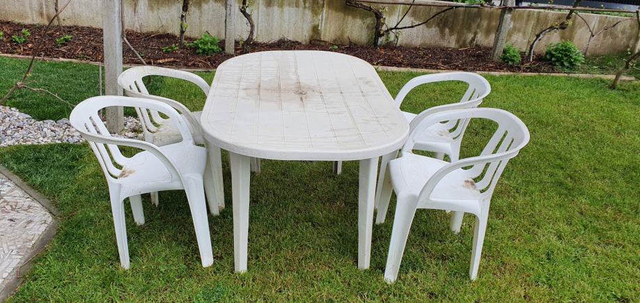 Prodam plastično vrtno garnituro miza in 4 stoli.