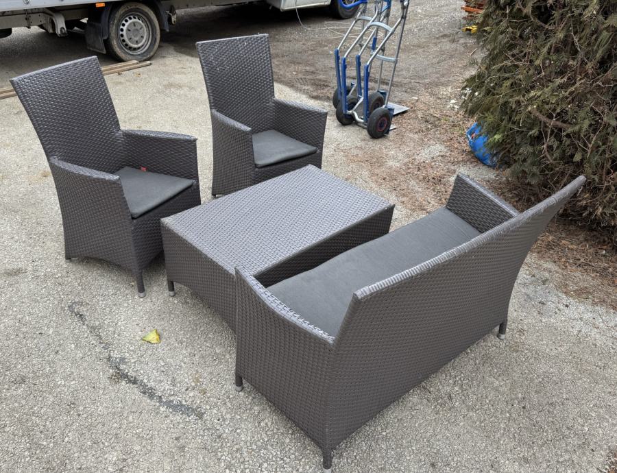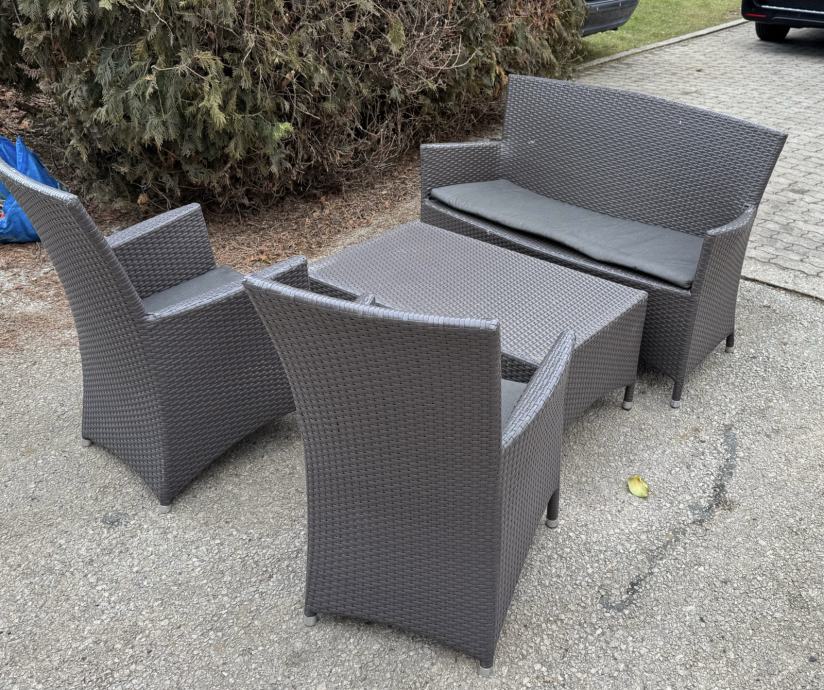 Prodam vrtno garnituro sestavljeno iz dvoseda 2 x fotelj in miza s steklom. Poleg tudi blazine