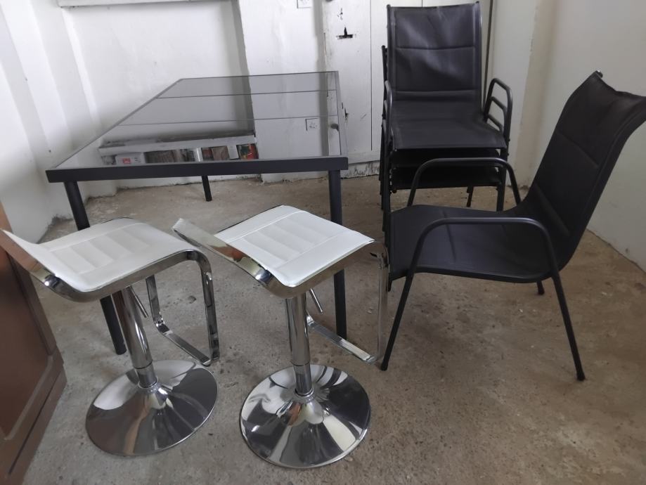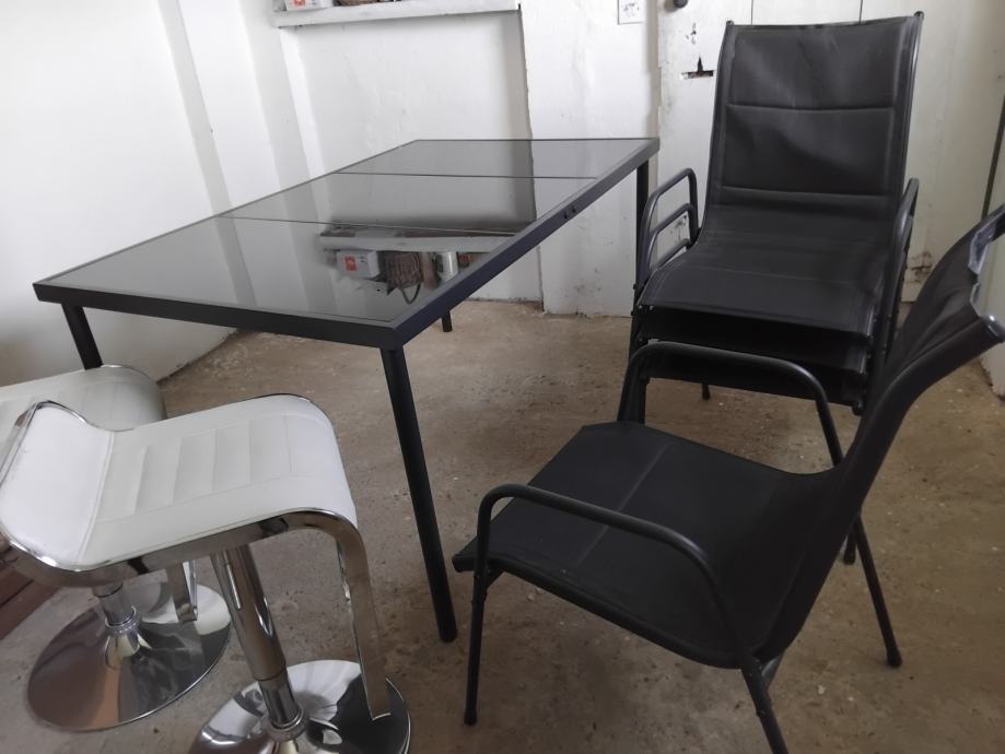 Prodamo odlično ohranjeno vrtno mizo in 6 stolov črne barve. Mita ima stekleno površino. Zraven prodamo še 2 barski stola srebrno/bele kombinacije.