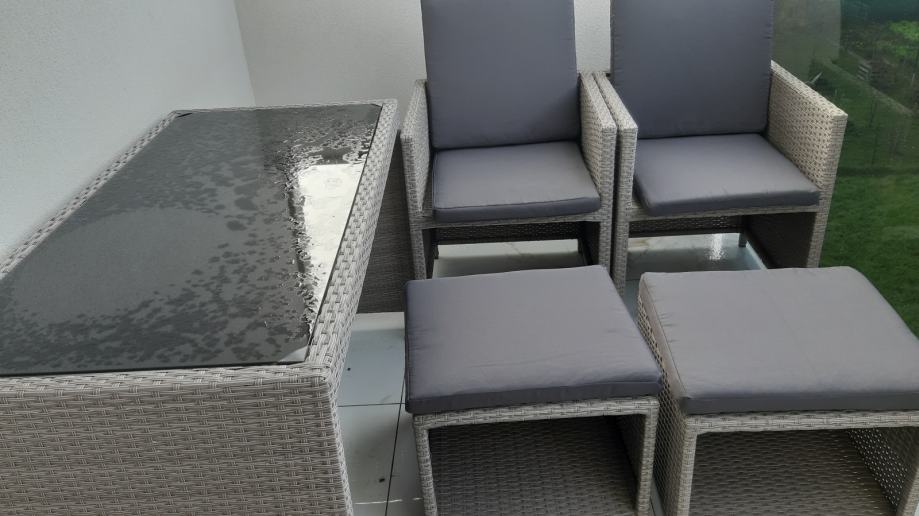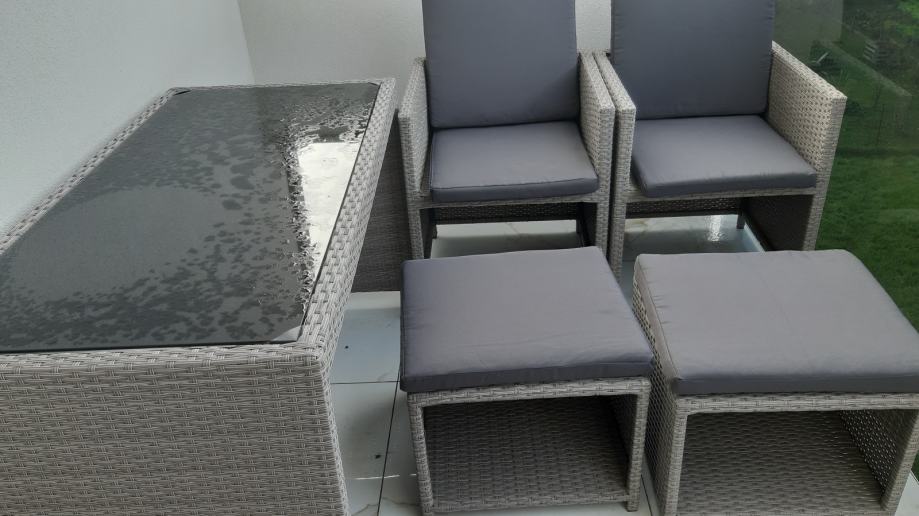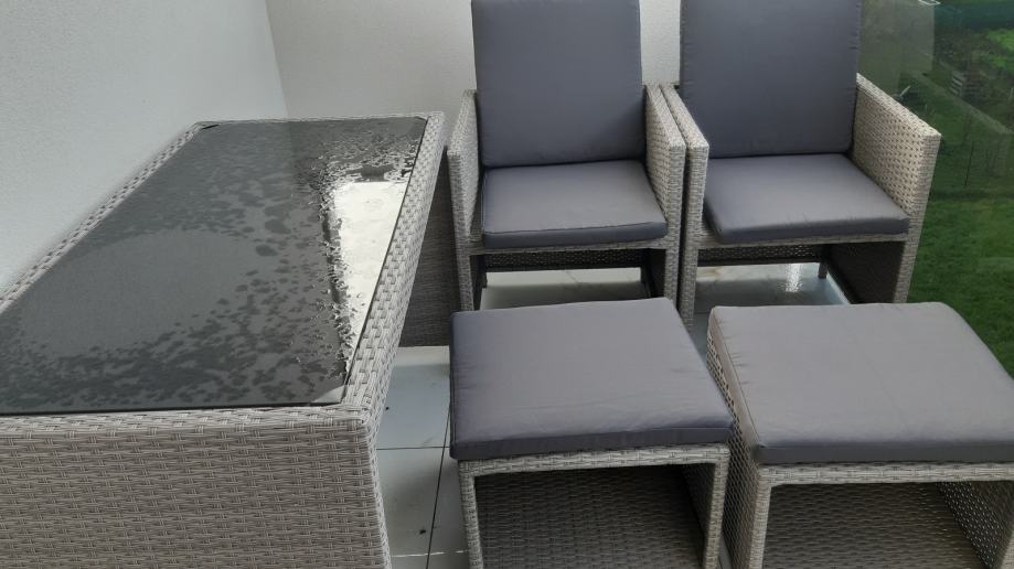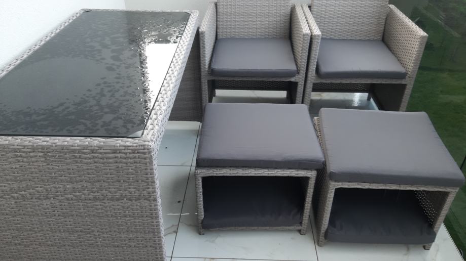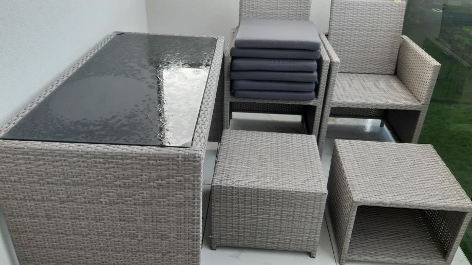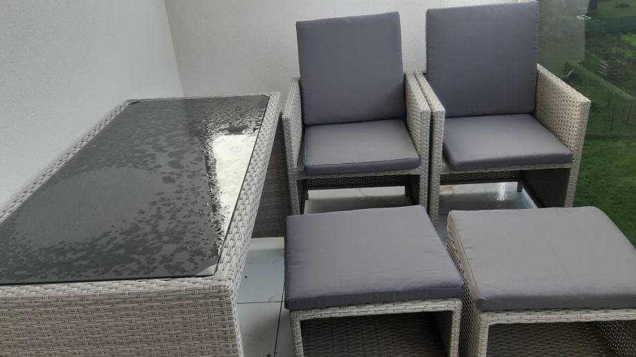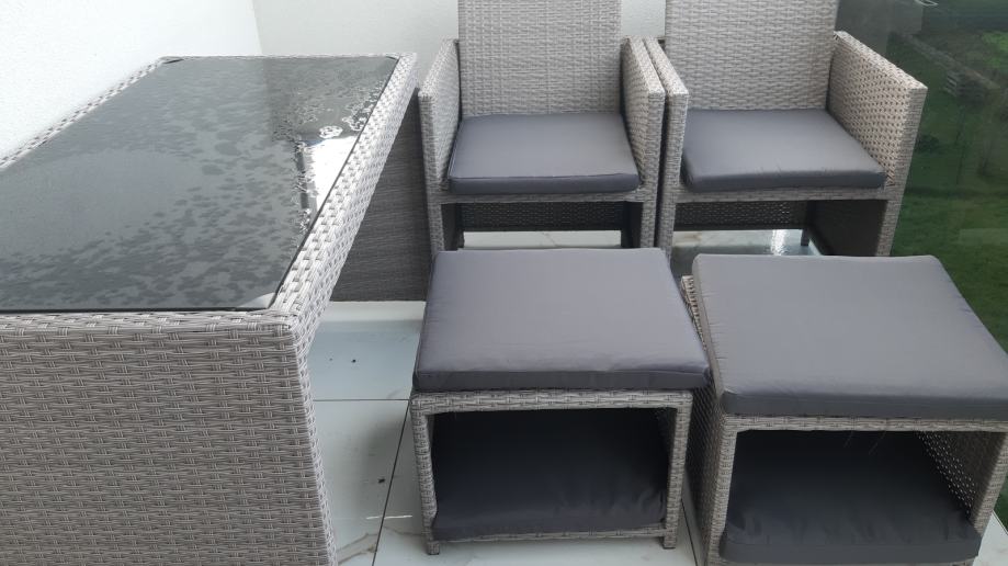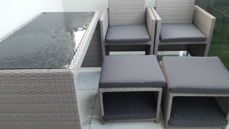 ZARADI SELITVE PRODAJA V KOMPLETU,MIZA,STOLI,BLAZINE,NASLONJALO ZA NOGE.STOLI SO ZLOŽLJIVI.DODAM VSEH 6 BLAZIN.KUPLJENA SEPTEMBRA LETOS.041/394-357