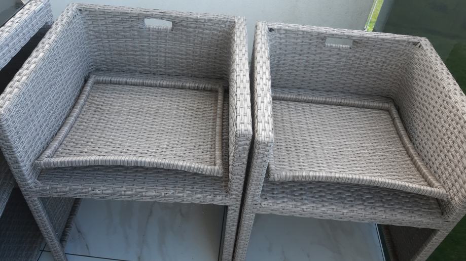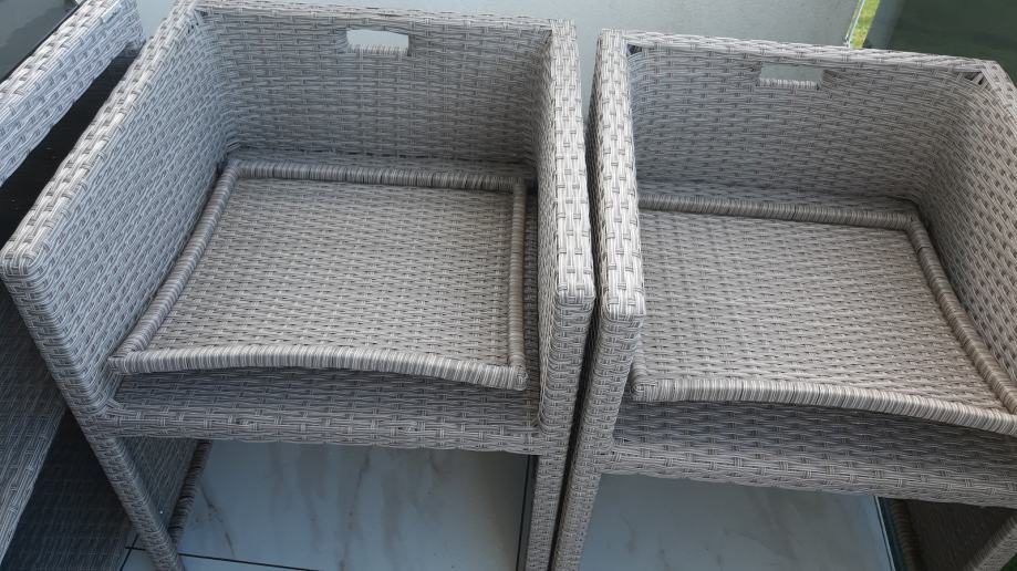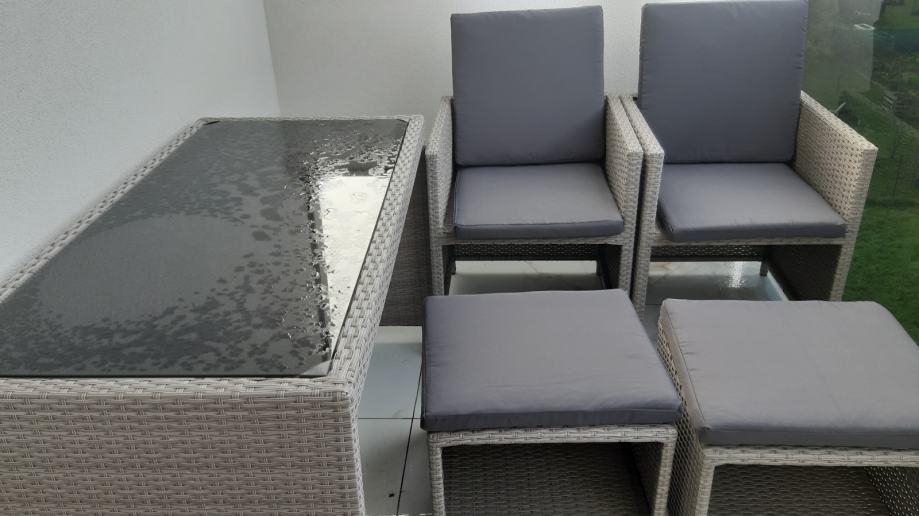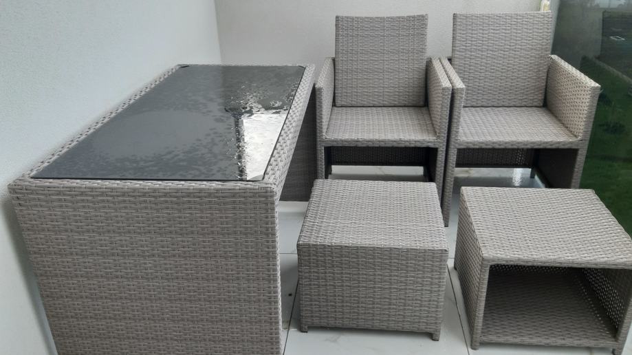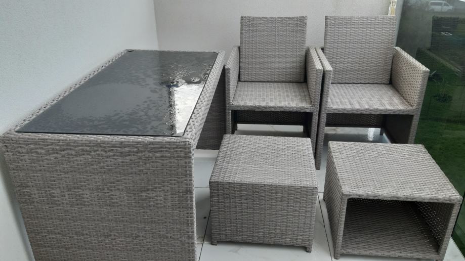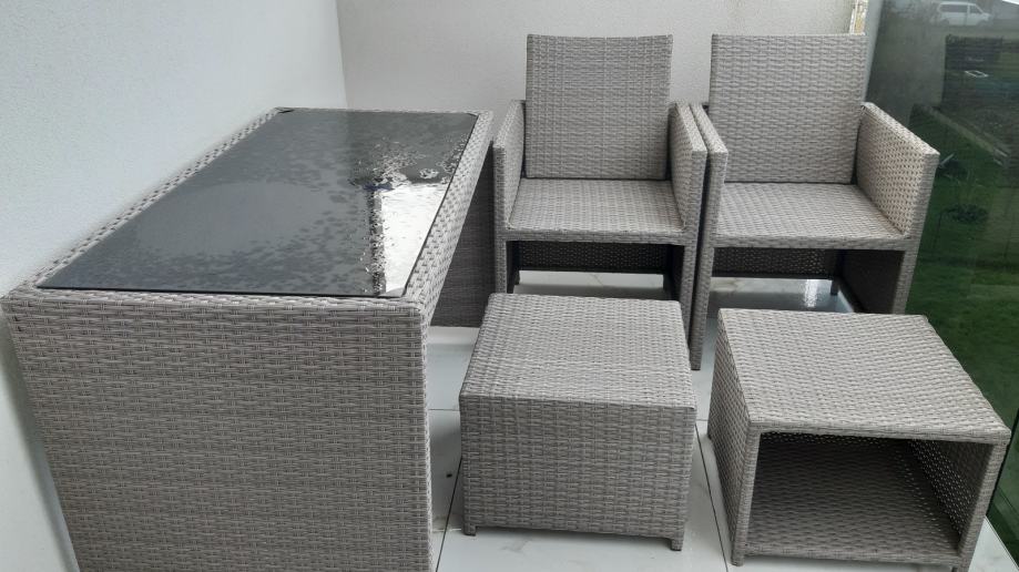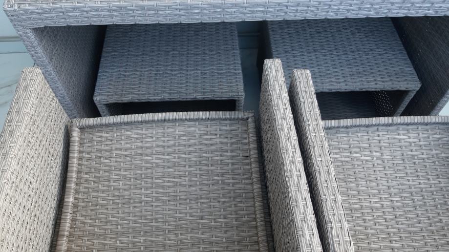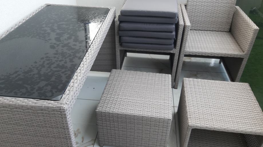 ZARADI SELITVE PRODAJA V KOMPLETU,MIZA,STOLI,BLAZINE,NASLONJALO ZA NOGE.STOLI SO ZLOŽLJIVI.DODAM VSEH 6 BLAZIN.KUPLJENA SEPTEMBRA LETOS.041/394-357