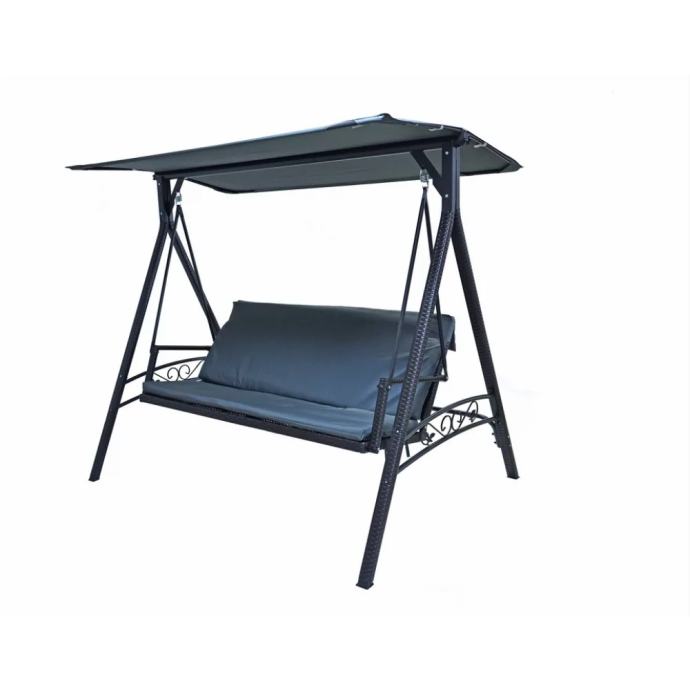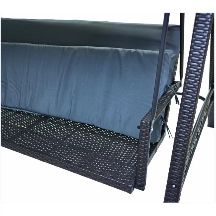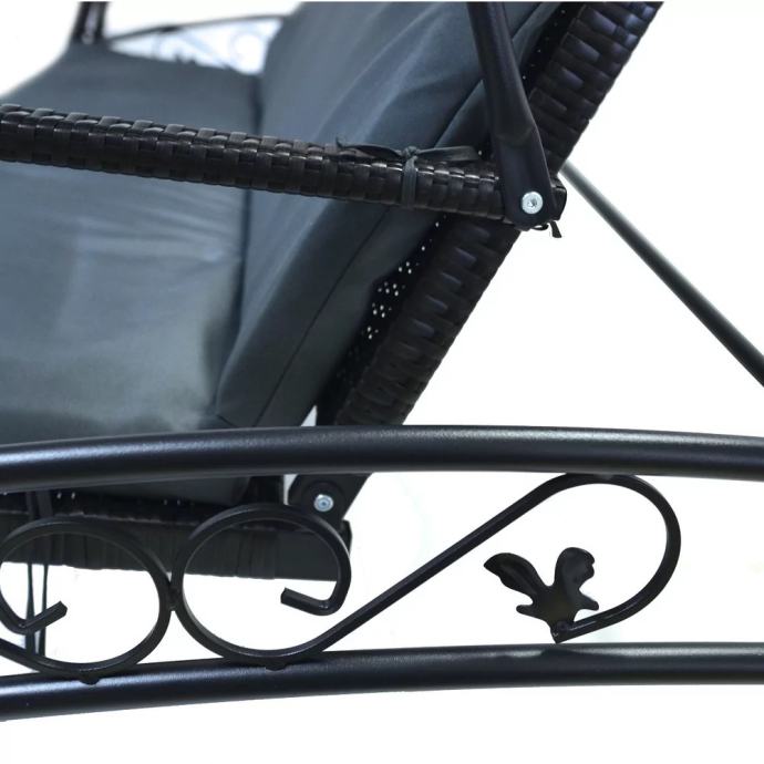 Vrtalni gugalnik s kovinsko konstrukcijo in umetnim ratanom. Priložena je tudi udobna blazina v sivi barvi.
