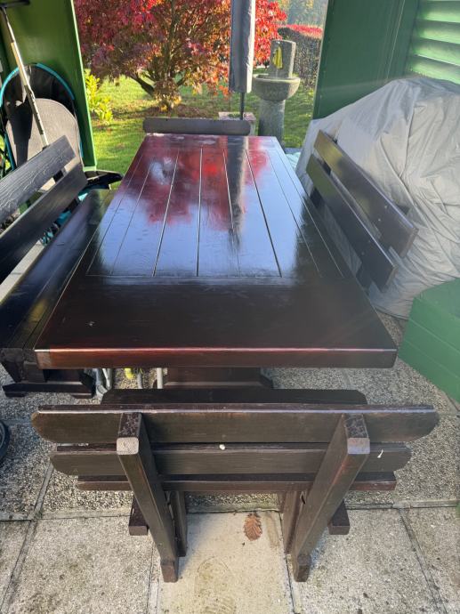 Miza masiva hrast in 4 klopi iz masive. Dimenzija mize 240 cm x 92 cm. Redno negovano.