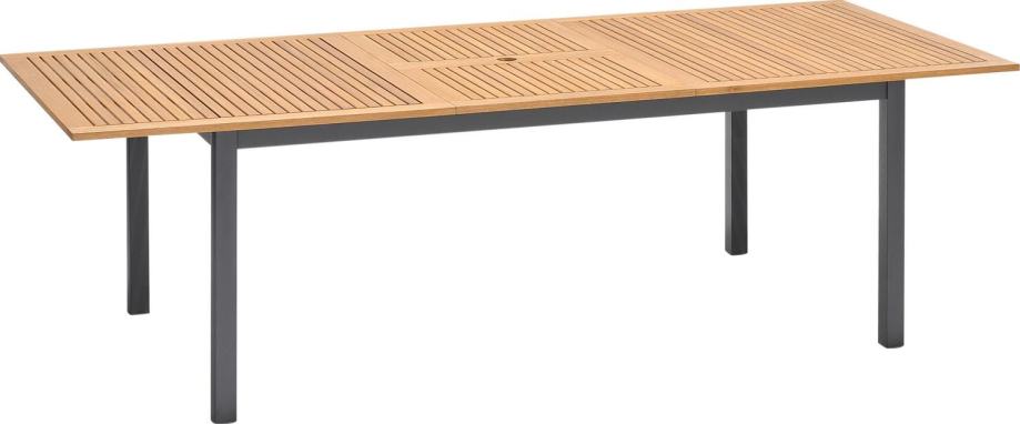 Pravokotna vrtna miza iz serije Bonlee deluje žlahtno elegantno. Je velike površine in kot nalašč za večja praznovanja na vrtu z večjim številom gostov. Njegov kovinsko sivo obarvani okvir je čistih linij preprosto oblikovan in brez opornikov. Površino mize sestavljajo lesene letvice v videzu svetlega hrasta, ponuja pa posrečen kontrast okvirju in nogam mize. Ogrodje je izdelano iz lahkega in trdnega aluminija. Plošča je izdelana iz robustnega in trpežnega lesa evkaliptusa.Razširljiva miza s certificiranim pravim lesomMiza ima vgrajeno podaljšek. Če slednjega ne izvlečete, ostane očem skrit pod površino mize. Na sredini raztegljive plošče mize je pripravljena priročna odprtina za senčnik. Tako lahko udobno sedite za mizo s svojimi gosti in ste idealno zaščiteni pred močno sončno svetlobo. Miza je izdelana iz visokokakovostnega trdega lesa s certifikatom FSC®, ki je bil pridobljen v trajnostnih pogojih in na okolju prijazen način. Mere mize v nerazširjenem stanju so 180 cm × 100 cm (Š x G), podaljšati pa jo je mogoče na 240 cm. Ponuja dovolj prostora za do osem oseb. S težo skoraj 30 kg jo dve osebi z lahkoto preneseta.
