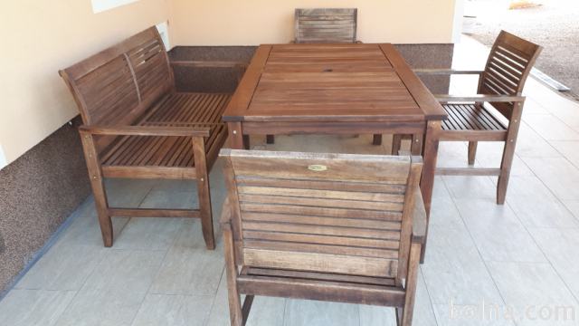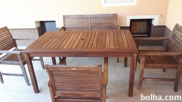 Lesena vrtna miza s tremi stoli in klopjo. Dimenzije mize 150 cm dolžine in 90 cm širine.