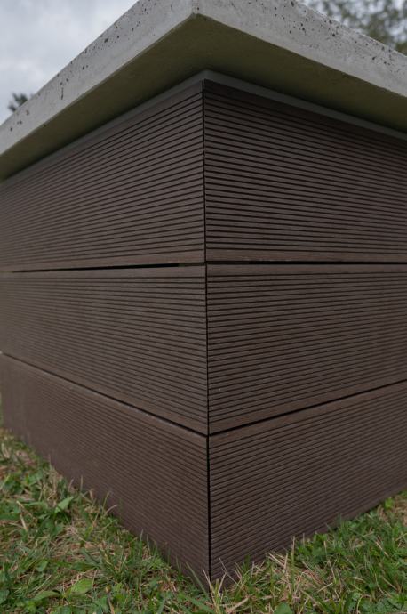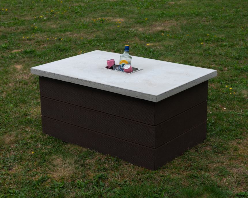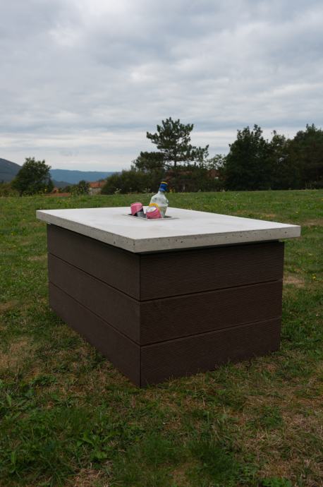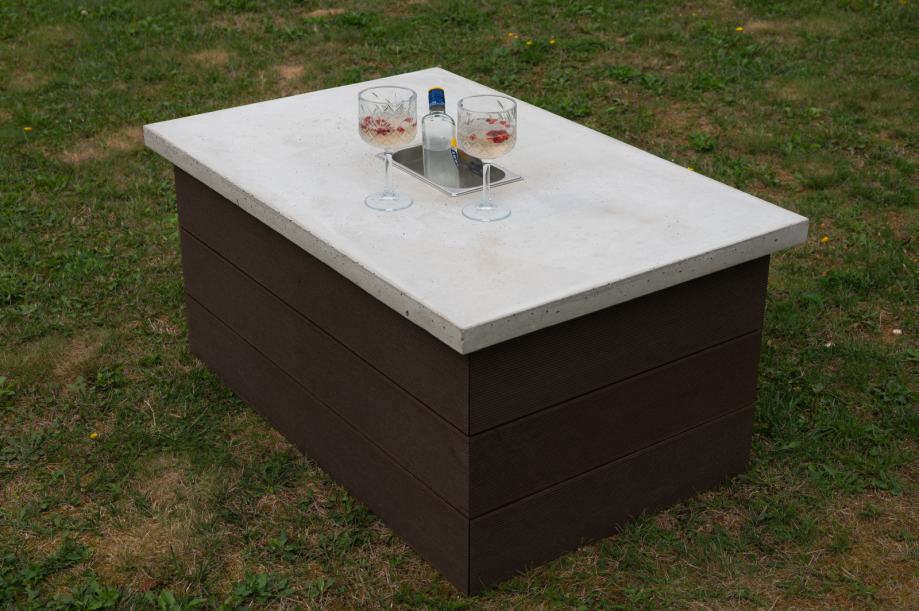 Prodam vrtno mizo narejeno iz lesenega ogrodja, na katerega so pritrjene wpc deske (kavne barve). Plošča je betonska z vgrajeno inox posodo. Pod to ploščo je okrog mize vgrajen profil za možnost vgradnje LED traka.