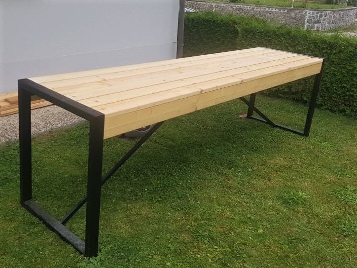 Ogrodje mize je iz inoxa prašno barvano v črni mat barvi, les pa je iz smreke (oljeno). Dimenzije d/v/š: 290 cm/85 cm/72 cm.