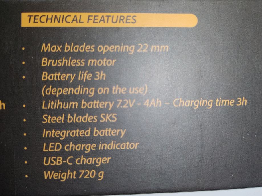Prodam NOVE električne škarje za obrezovanje VOPI Predator PV220 -Električne brezžične škarje z vgrajeno baterijo PV220 -Brezkrtačni motor -Izmenljiva jeklena rezila -Največja odprtina rezil je 22 mm -Dva položaja odpiranja rezila s spominom -LED lučka za osvetlitev delovnega območja -Priložena torbica -Integrirana litijeva baterija -Napetost 7,2V -Moč motorja 180W -Priložen s kabel USB-C za polnjenje baterije -Funkcija hitre zaustavitve v stanju pripravljenosti -Barvni indikator nivoja baterije