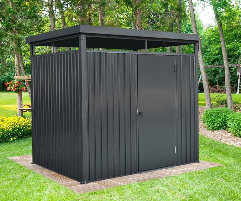 Kovinsko lopa za orodje Floraworld prepriča s sodobnim videzom in zelo dobro kakovostjo obdelave. Površina lope meri 4,43 m², kar je dovolj prostora za varno in pred vremenskimi vplivi zaščiteno shranjevanje vrtnega pohištva, naprav, orodij idr. Ima nosilnost 150 kg/m², zato vam ni treba pozimi skrbeti zaradi snežne odeje.Kakovostna vrtna lopa z dolgo življenjsko doboVrtna lopa je narejena iz pocinkanega jekla in prepriča, ker je odporna na vremenske vplive in ima dolgo življenjsko dobo. Lakiranje antracitne barve zagotavlja všečen videz in dodatno zaščito pred vremenskimi vplivi in praskami. Poleg tega ima vrtna lopa žleb za deževnico in sistemom za odvajanje vode, da lahko deževnica načrtno odteka in okoli vrtne lope ne nastajajo večje luže. Skupne mere vrtne hišice, vključno s streho, so (Š x G) 245 cm x 204 cm, sleme pa v višino meri 226 cm.Velik vhod z varnim sistemom zaklepanjaVrtna lopa ima krilna vrata, ki so široka 79 cm in visoka 187 cm. Nudi vam dovolj prostora za vstop v lopo, tudi z vrtnim orodjem in drugimi večjimi vrtnimi pripomočki. Vsebina vaše vrtne lope je varna, saj lahko vrata zaklenete z vgrajeno ključavnico. Zadostno svetlobo zagotavljajo tudi veliki svetlobniki.Preprosta montažaDa bo montažo čim lažja, lopo za orodja dobavljamo kot komplet z vsemi deli. Za to dobite zelo dobro opisana navodila za montažo, s katerimi bo postavitev še posebej preprosta.
