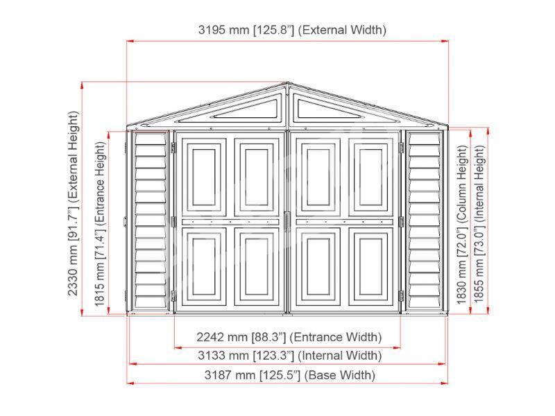 Široka dvojna sprednja vrata (224 × 181 cm) – primerna za avtomobile, vrtne traktorje ali motorje.
