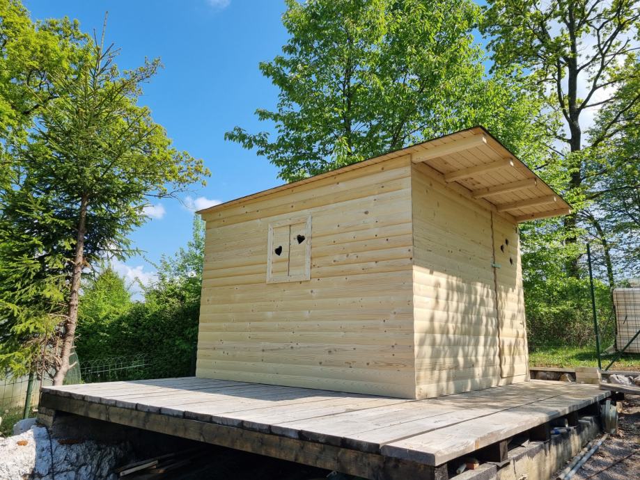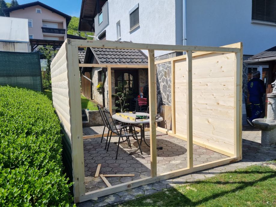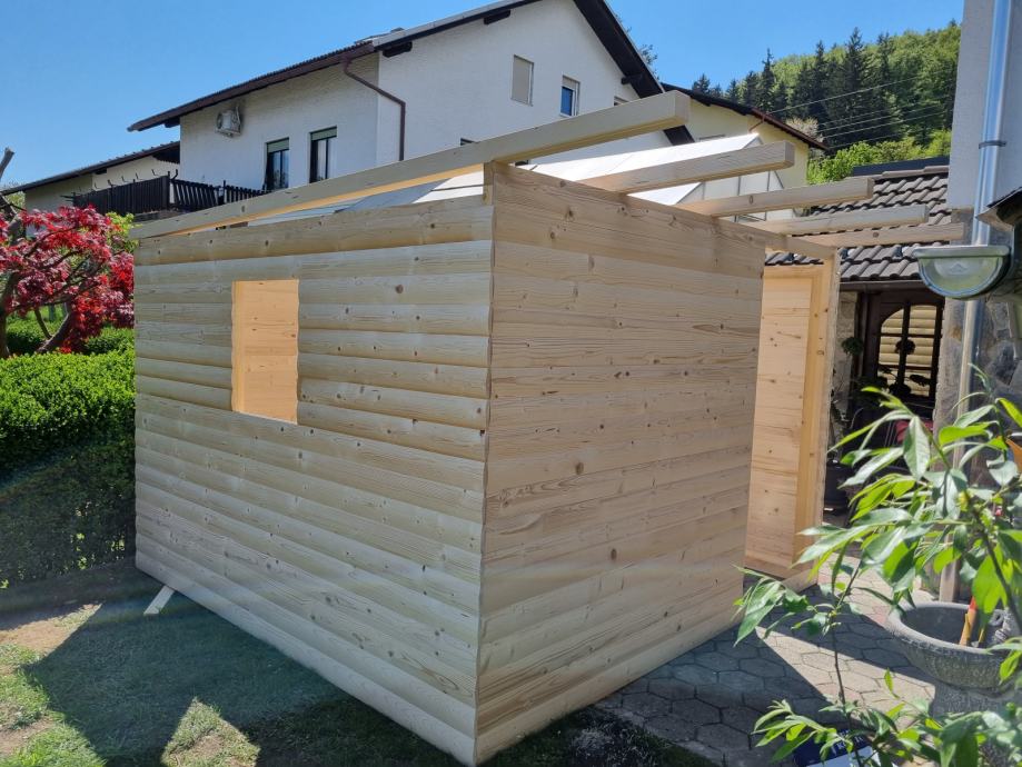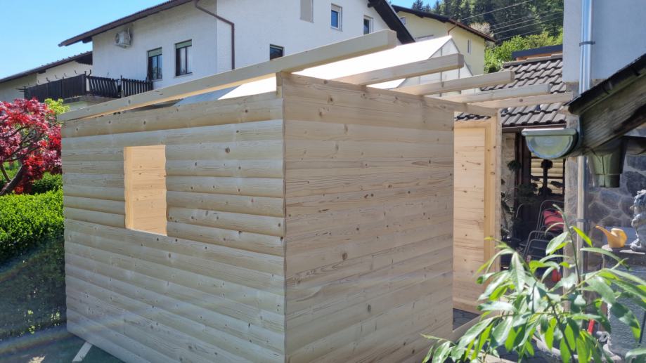 Izdelujemo vrte ute ta na sliki je 3x3m višina spredaj 2.20m zadaj 2m, uta je izdelana iz panelov za lažji transport in lažho sestavo, ogrodje je narejeno iz 5x8 + obito z bruno debeline 2cm okna in vrata naredimo doma. Lahko oljimo ali inpregniramo, na streho damo "dahpapo" folijo s posipom. Vi morate samo pripraviti plato ali tlakovce, travne plošče.