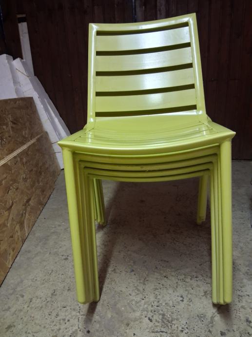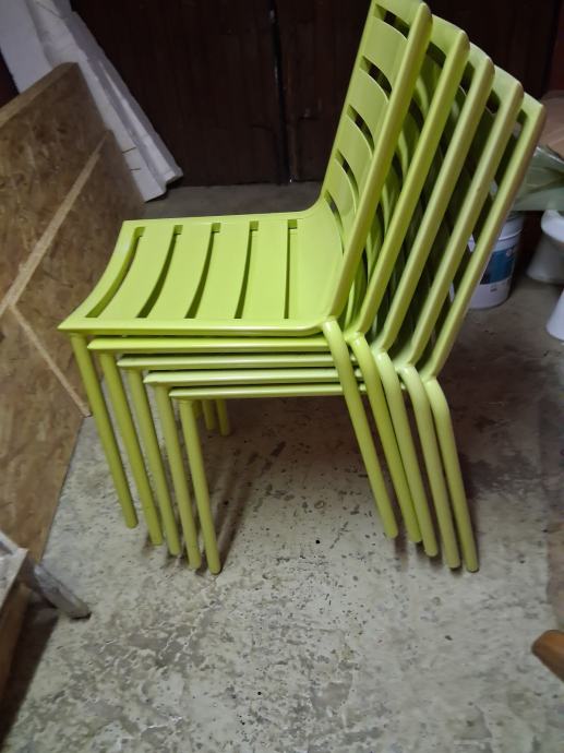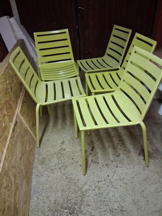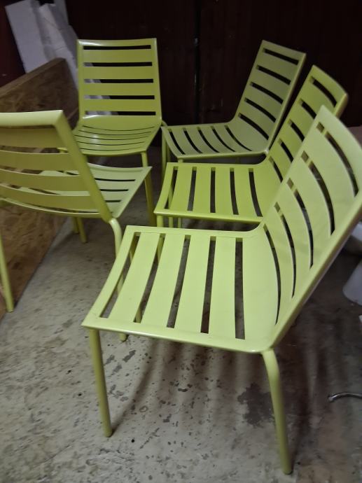 Prodam 5 stolov iz litega aluminija, prašnato pobarvani v zeleno barvo. 2 stola sta v svetlejšem odtenku zelenko kot ostali trije.