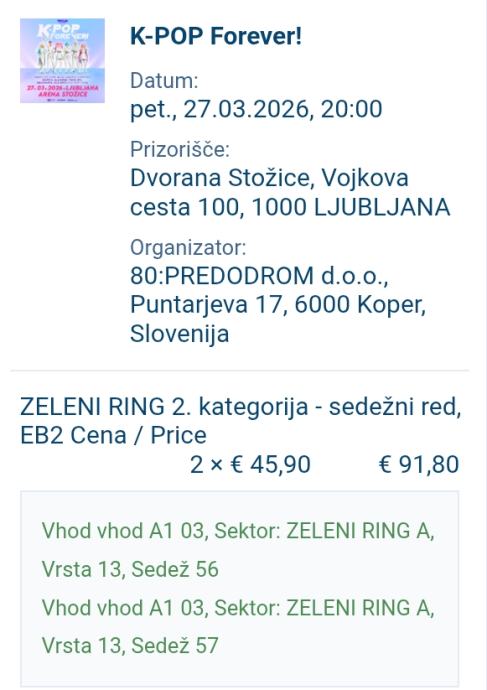 Prodam 2 vstopnici za K-POP forever koncert v Stožicah 27.3.2026.