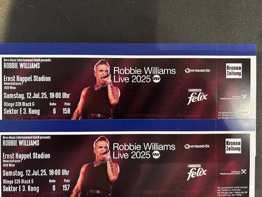Prodam dve karte za Robbia Williamsa Dunaj 12.7. sedišče sektor E3,blok G. Cena je za 2 karte.