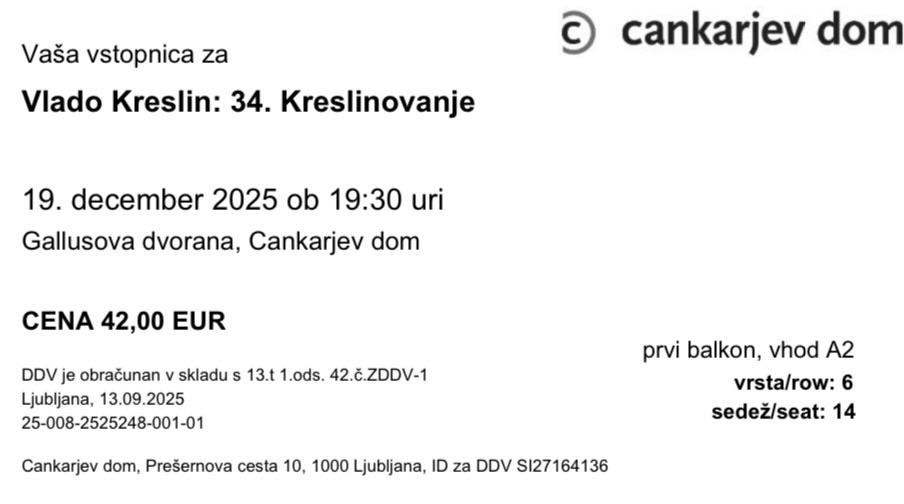 Prodam vstopnice za Kreslinovanje, ki bo 19. decembra v Cankarjevem domu.