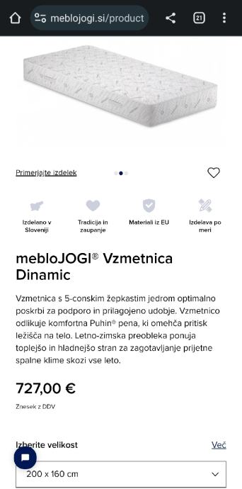 Prodamo 10 let staro vzmetnico Meblojogi dinamic hard. Lepo ohranjena, saj je bila uporabljena skupaj z nadvložkom. Prevzem v Velenju.