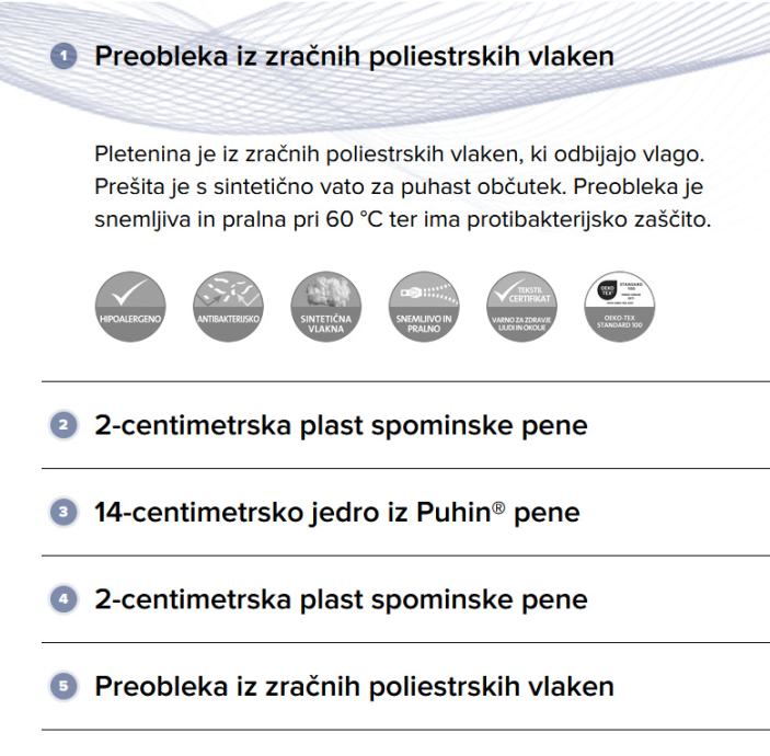 Prodamo samo preizkušeno ležišče s 5-conskim ergonomskim jedrom iz Puhin® pene, ki zagotavlja zanesljivo podporo in zračnost, plast spominske pene pa poskrbi za udobje in razbremenitev mišic. Zaradi izbranih materialov je primerna izbira za astmatike in alergike.