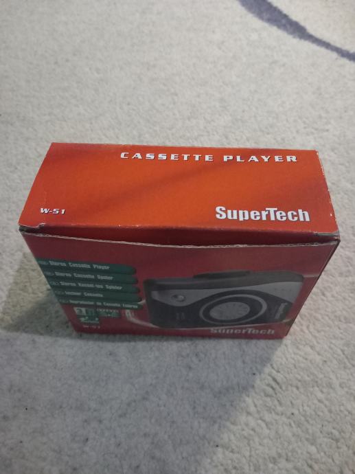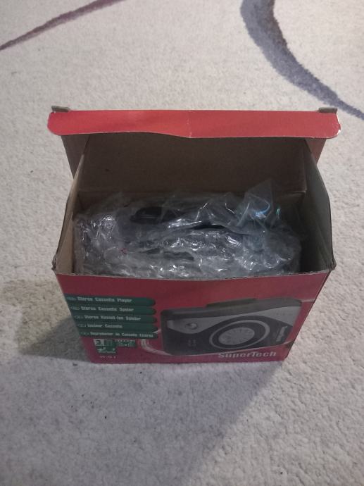 Zapakiran predvajalnik kaset, znamke SuperTech, deluje na baterije, priložene slušalke.