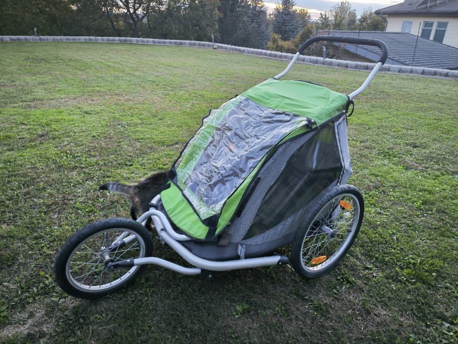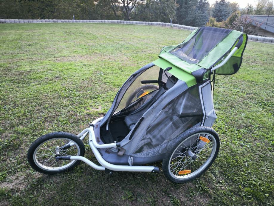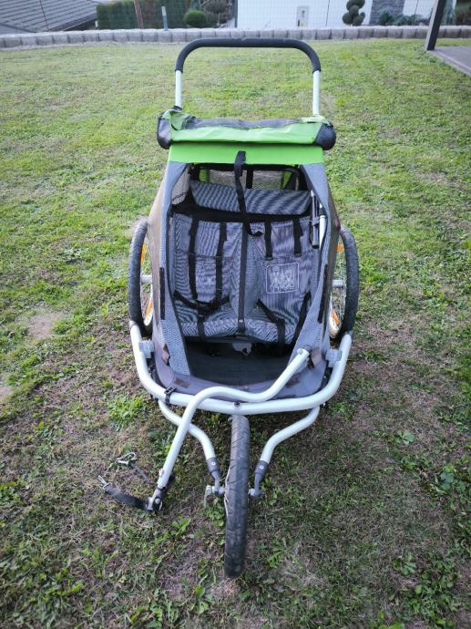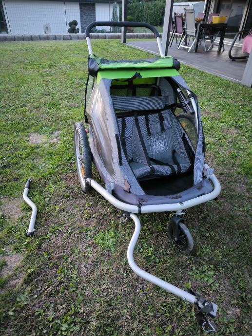 Prodajamo voziček za 2 otroka,ker so ga naši otroci prerasli. Ima veliko kolo za off road pohajkovanja,majhno kolo za sprehode po mestu za lažje manevriranje, možen je priklop na kolo. Poleg je še vstavek za novorojenčka in senčka ki ščiti pred soncem.