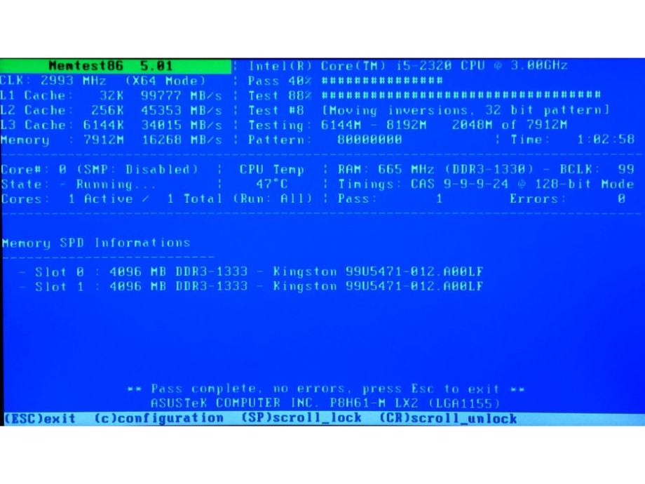 Maks. pomnilnik za to ploščo je 8GB - oba spominska modula po 4GB DDR3 sta Kingston in sta testirana z MemTest86 5.01 - sta brezhibna (gl. sliko testa).